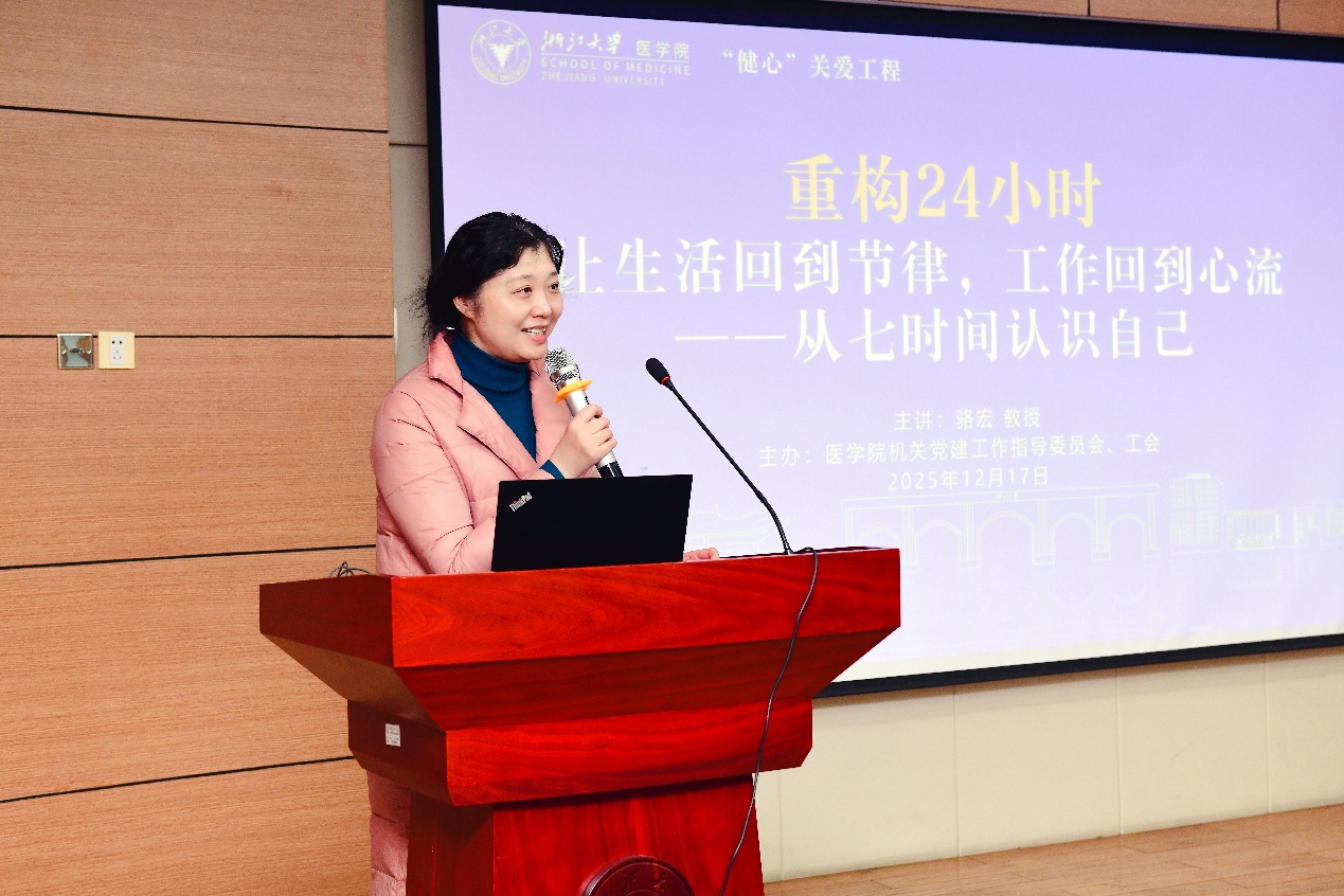 2025年12月17日,为深入贯彻落实“健康中国”战略部署,积极响应提升全民心理健康素养的号召,浙江大学医学院机关党建工作指导委员会、医学院工会举办“健心”心理健康促进专题讲座。讲座特邀浙江大学医学院附属精神卫生中心(杭州市第七人民医院)党委书记骆宏教授,作题为《重构24小时:让生活回到节律,工作回到心流》的专题报告。医学院及校内广大师生积极参与。
